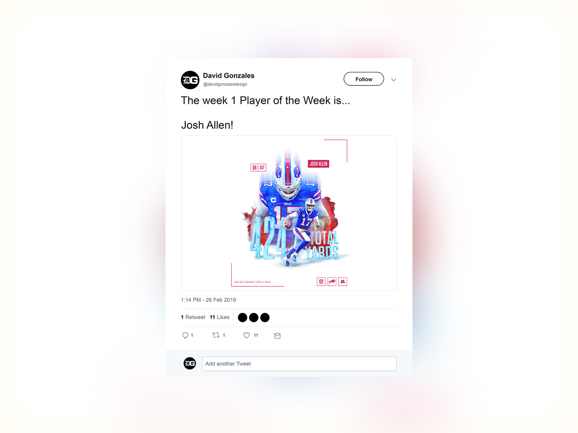 The NFL25 Challenge is a personal challenge I created for myself to help grow my skills as a Sports Graphic Designer. Each week, I must select a player that performed well and create them a social media graphic. The catch? It must be done in a different style than previously done and a player cannot be done twice. Week 1: Josh Allen’s 424 yard performance vs. Baltimore.